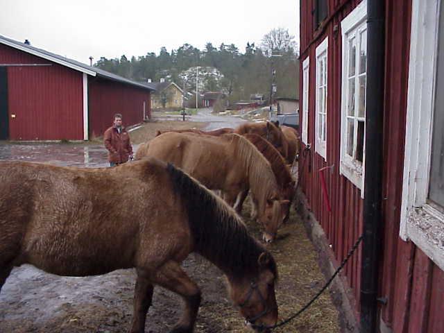 Alla samlade vid stallet för att prova sadlarna med Sadel DR Jimmy i bakgrunden